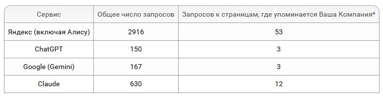 Мы ведём серверную статистику посещений ботами нейросетей, показывающую ориентировочные данные: